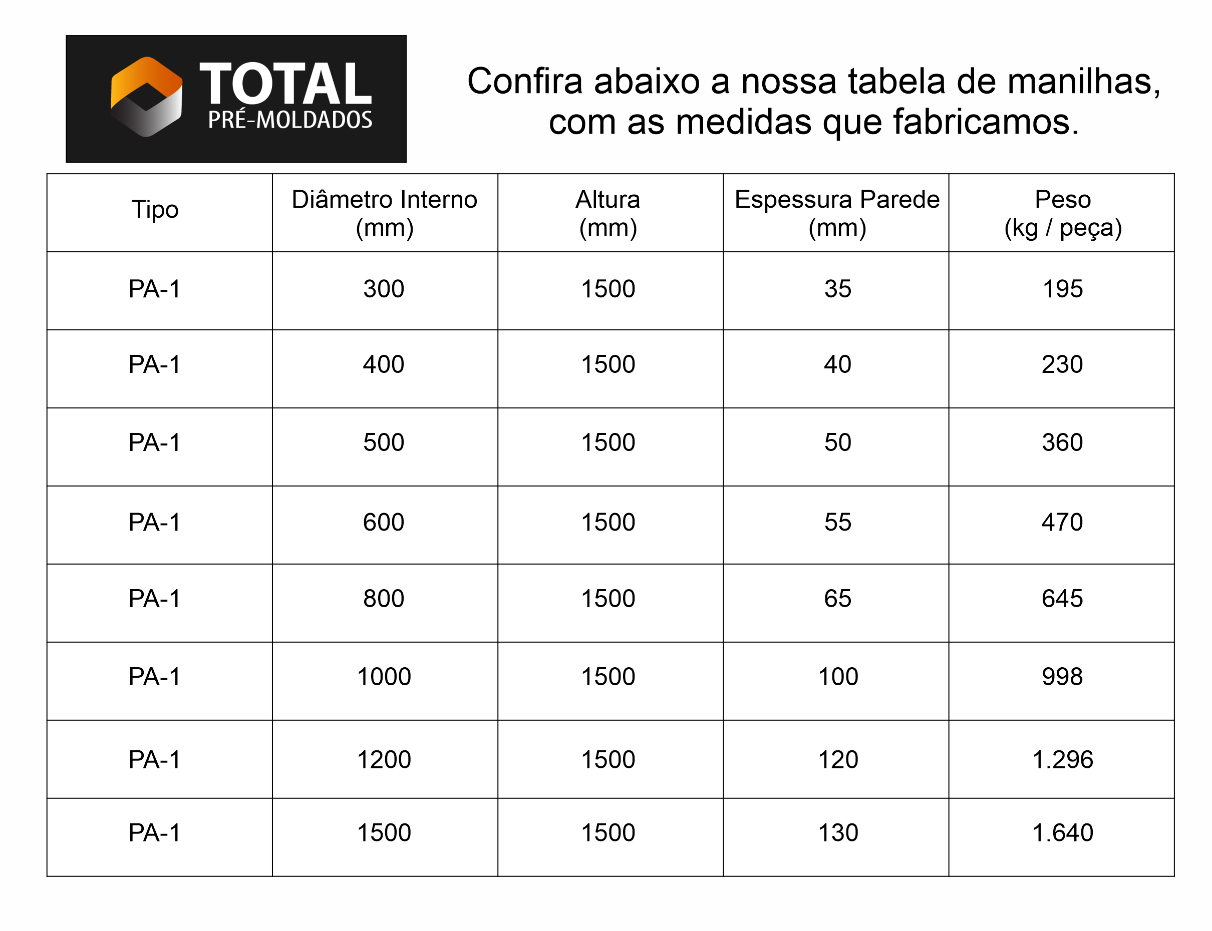 A Total Premoldados fabrica manilhas do tipo PA-1 que são modelos de manilhas de concreto armado. Entretanto, suas cargas mínimas de ruptura e de fissura variam entre cada tipo.